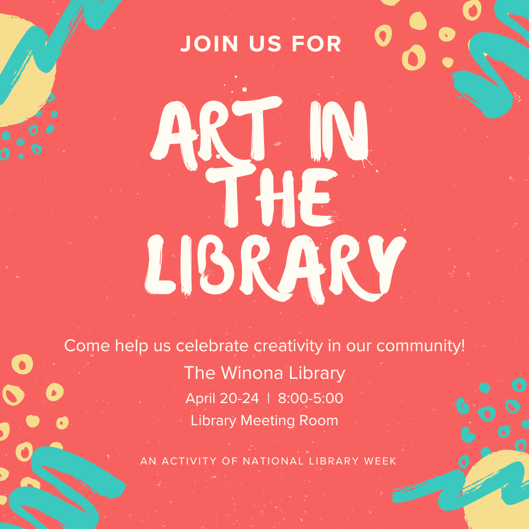 Come help us celebrate creativity in our community!  Local artists will have art and crafts on display throughout the week in the library meeting room.