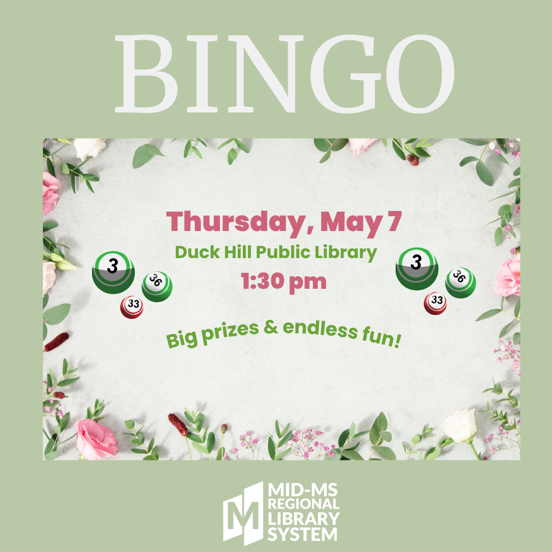 Bingo Please join us for Bingo Thursday, May 7th at 1:30 pm. Light refreshments and lots of fun will be served. + Add to Google Calendar + iCal / Outlook export Date May 07 2026 Time 1:30 pm Location Duck Hill Public Library 127 North State Street Duck Hill, Mississippi 38925 Website https://midmisslib.com/duckhill/ Category Adult Programs Duck Hill Public Library Share this event