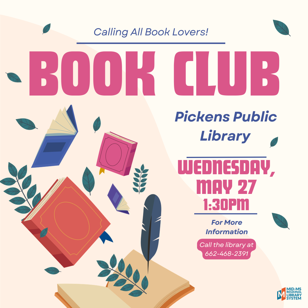 Book Club Join us for Book Club! + Add to Google Calendar + iCal / Outlook export Date May 27 2026 Time 1:30 pm Location Pickens Public Library 309 Highway 51 Pickens, Mississippi 39146 Website https://midmisslib.com/pickens/ Category Adult Programs Pickens Public Library Share this event