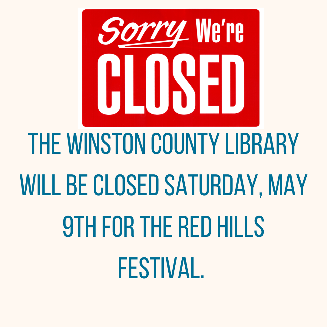 Closed For Red Hills Festival The Winston County Library will be closed for the Red Hill’s Festival Saturday, May 9, 2026. + Add to Google Calendar + iCal / Outlook export Date May 09 2026 Time 9:00 am - 1:00 pm Location Winston County Library 100 West Park Street Louisville, Mississippi 39339 Website https://midmisslib.com/winston/ Category Winston County Library Share this event