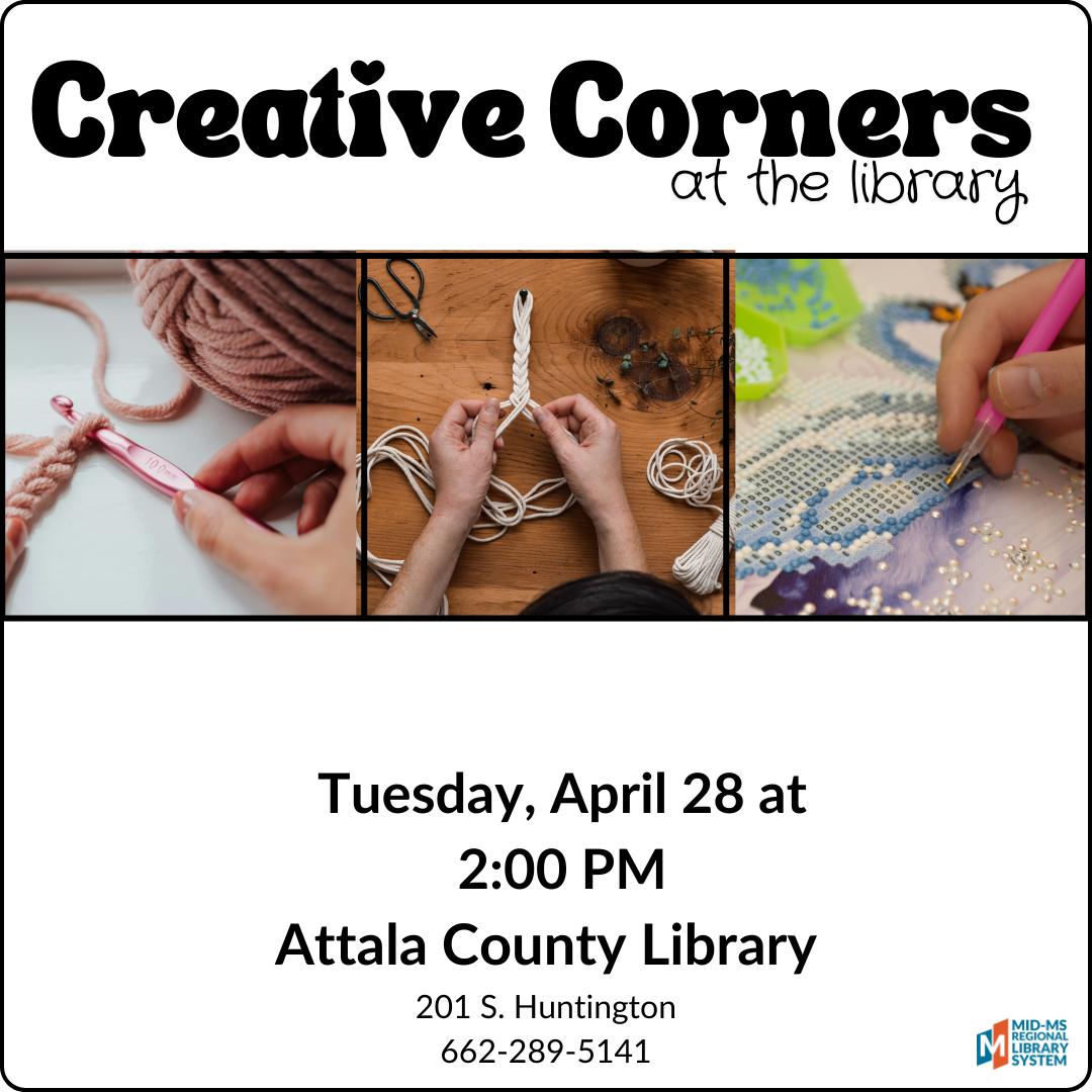 Join us at Creative Corners on April 28th at 2:00 PM for an afternoon filled with crafty fun and other exciting activities! For further details, please call 662-289-5141
