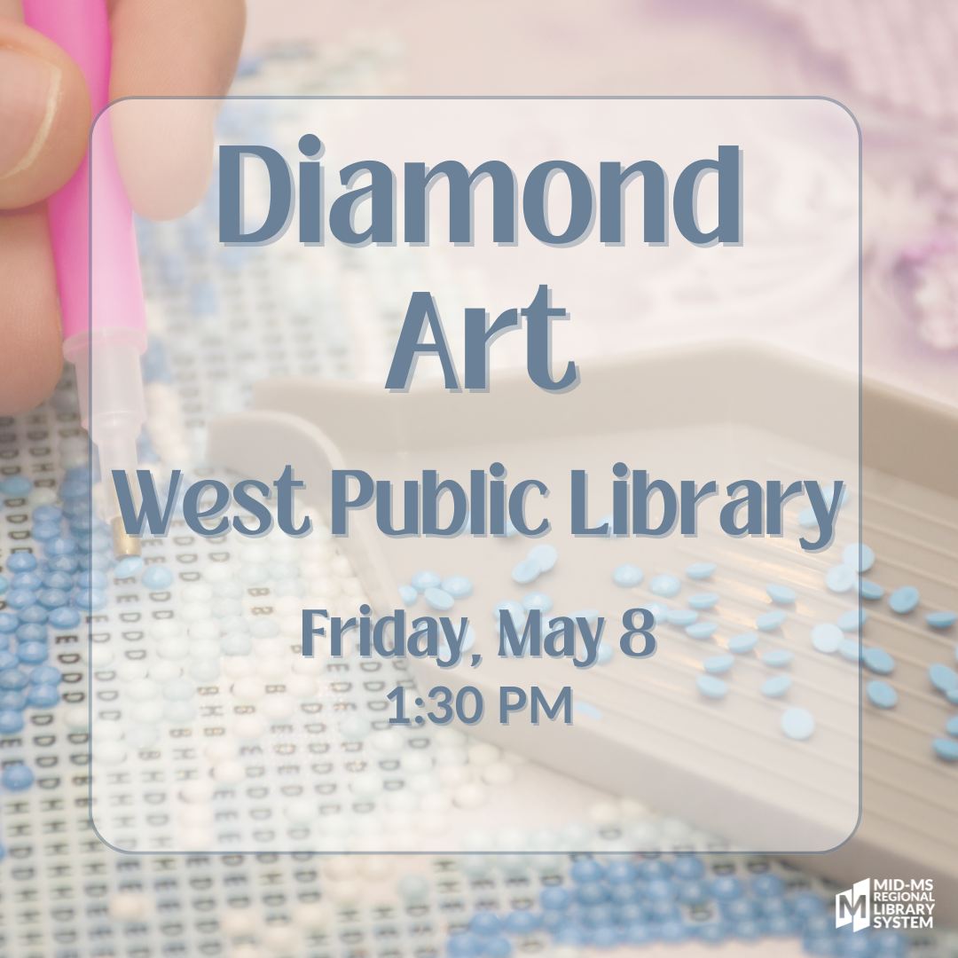 Diamond Art We hope you can join us for a relaxing time making diamond art. + Add to Google Calendar + iCal / Outlook export Date May 08 2026 Time 1:30 pm - 2:30 pm Location West Public Library 24843 Highway 51 West, Mississippi 39192 Website https://midmisslib.com/west/ Category All Ages West Public Library Share this event