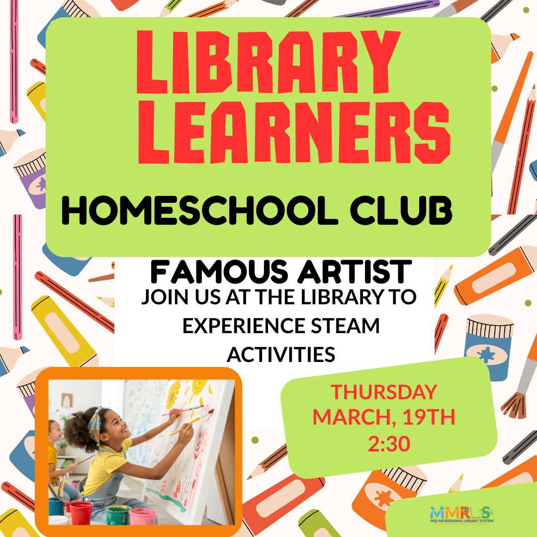 Library Learners Homeschoolers are invited to join us to learn about famous artists! + Add to Google Calendar + iCal / Outlook export Date Mar 19 2026 Time 2:30 pm Location Winston County Library 100 West Park Street Louisville, Mississippi 39339 Website https://midmisslib.com/winston/ Category Children's Programs Family Programs Teen Programs Winston County Library Share this event