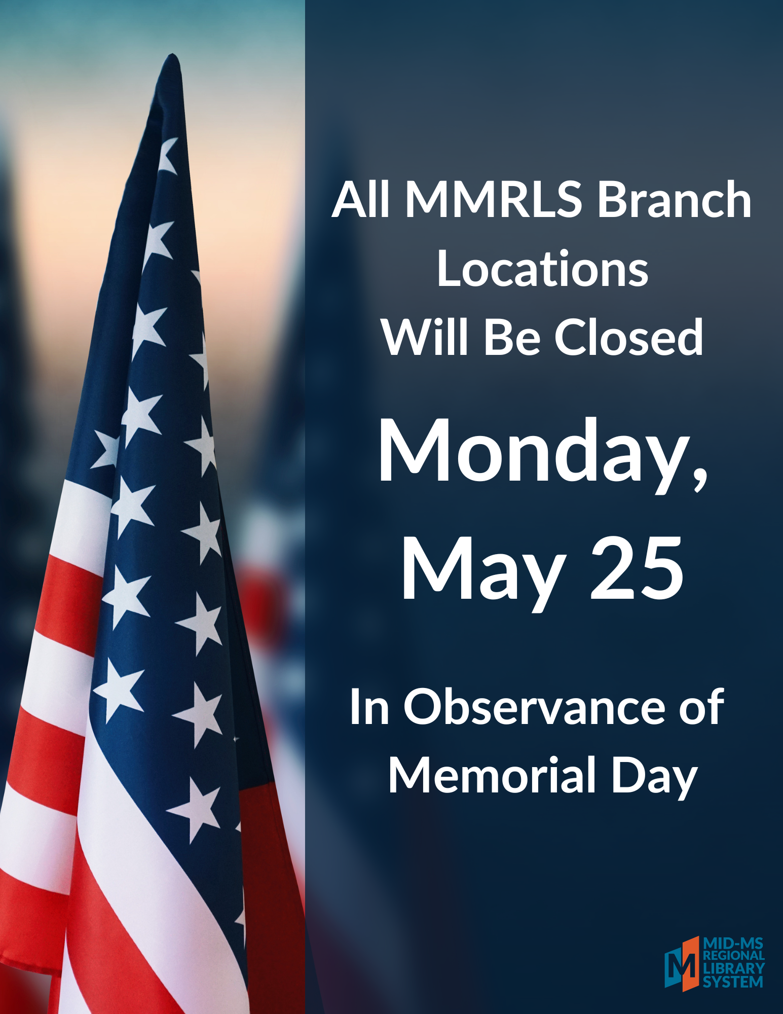 All MMRLS branch locations are closed today in observance of Memorial Day.