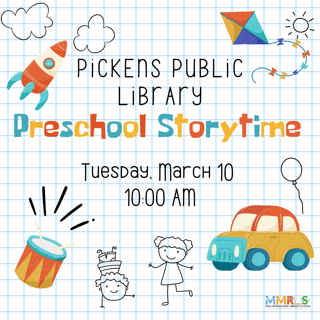Storytime Join us for storytime. + Add to Google Calendar + iCal / Outlook export Date Mar 10 2026 Time 10:00 am Location Pickens Public Library 309 Highway 51 Pickens, Mississippi 39146 Website https://midmisslib.com/pickens/ Category Children's Programs Early Literacy Programs Pickens Public Library Share this event
